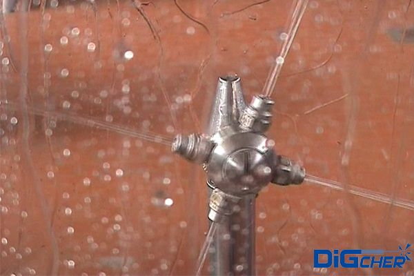 德高潔高壓水發(fā)酵罐自動清洗系統(tǒng)是利用高壓水射流的動能將發(fā)酵罐內(nèi)壁表面上的堅硬垢物擊碎,從而剝離并清除掉。具體清洗流程是將特制的三維洗罐器伸縮機構(gòu)安裝在發(fā)酵罐入口上,伸縮桿伸進(jìn)罐內(nèi),伸縮桿在罐內(nèi)伸縮和沿內(nèi)壁周圍方向移動。當(dāng)三維洗罐器水平旋轉(zhuǎn)時,水射流形成的旋轉(zhuǎn)力矩帶動噴嘴在垂直面內(nèi)旋轉(zhuǎn)。由于三維旋轉(zhuǎn)噴頭與伸縮桿的復(fù)合運動,高壓水射流可以覆蓋發(fā)酵罐內(nèi)任何位置,從而完成清洗。